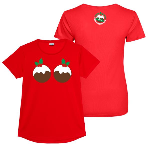 Our PUDDINGS design printed large on the front, and the Broad Haven Pudding Run 2023 logo printed small on the back.