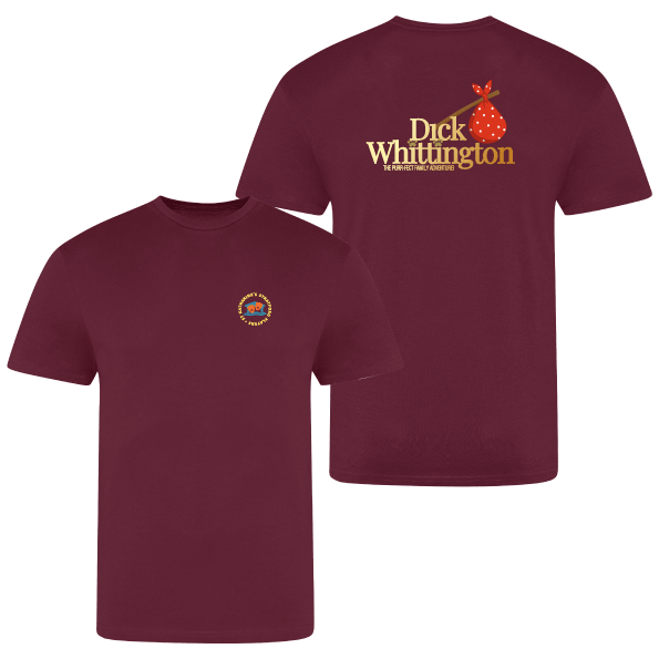 St Katherines Stratford Players logo embroidered to left chest, and Dick Whittington logo printed large on back.